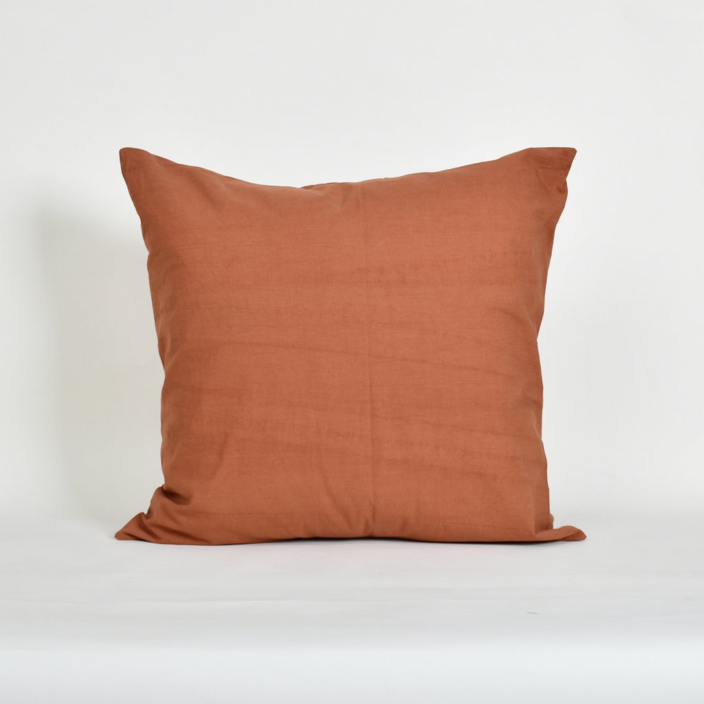 Confeccionado en tusor 100% natural, teñido y pintado a mano, este almohadón combina textura suave, calidad y un tono terracota muy actual que se integra perfecto con maderas claras, negras, grises y tonos neutros. Incluye relleno de vellón siliconado para que puedas usarlo apenas llega a tu casa.