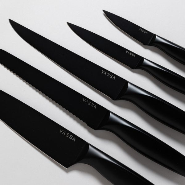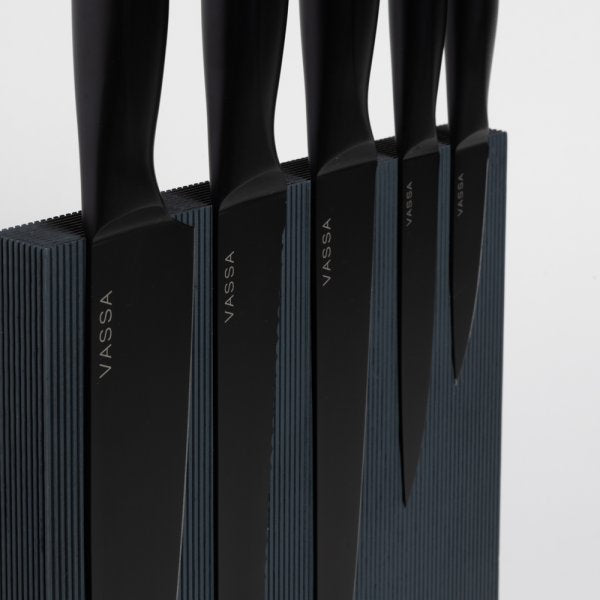 El Set por 5 cuchillos con taco imantado Black es la combinación perfecta de orden + diseño para tu cocina. El taco magnético mantiene cada cuchillo siempre a mano y bien presentado.