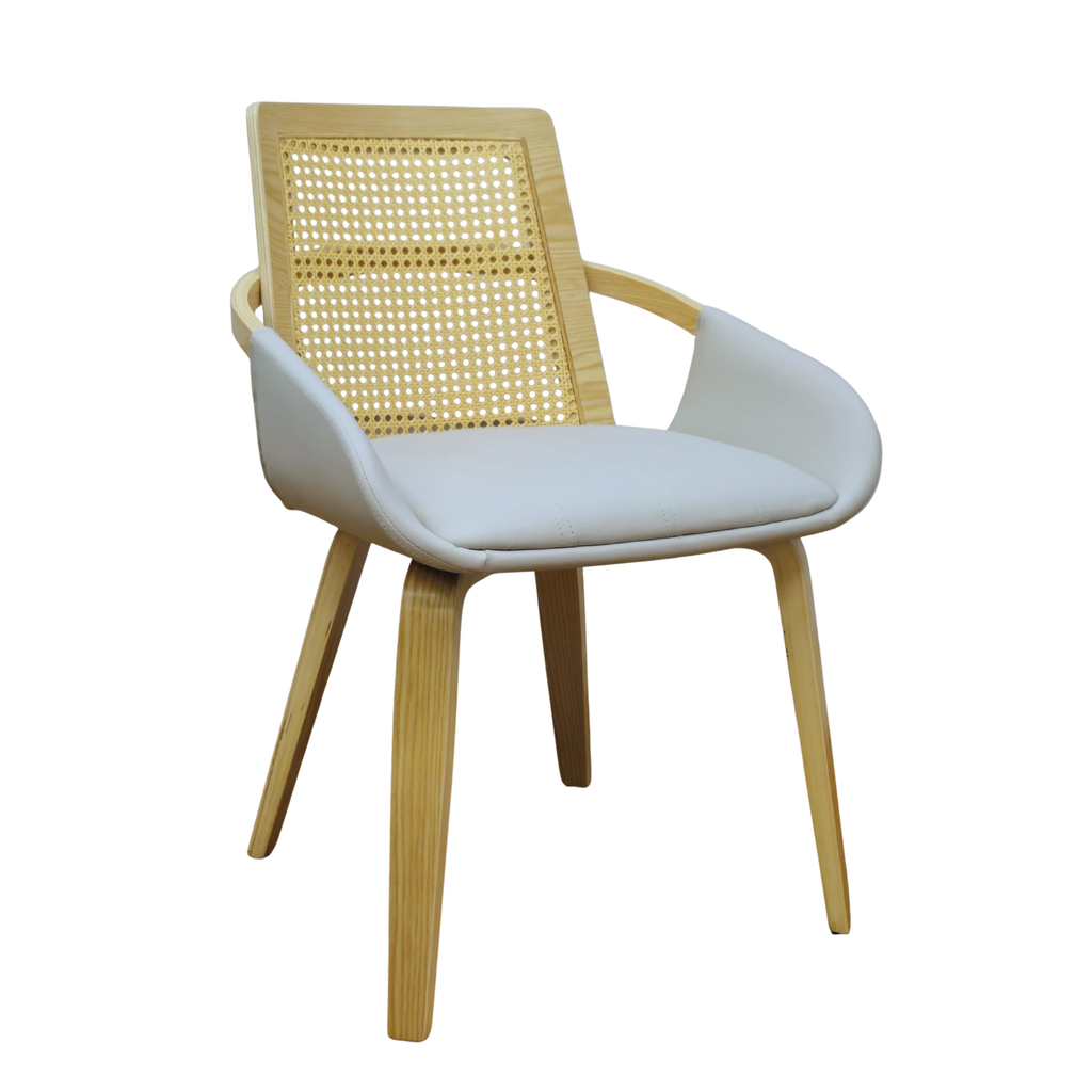 La silla AVA destaca por su excelente diseño, con patas de madera y tapizado en tela en ecocuero color natural que ofrece un asiento muy confortable.