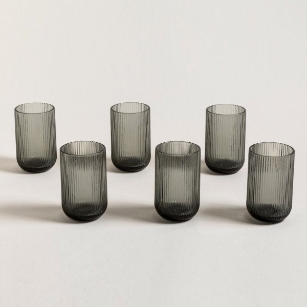 Set x 6 vasos altos de vidrio • Color fume sofisticado • 420 ml de capacidad • Vidrio prensado resistente apto lavavajillas